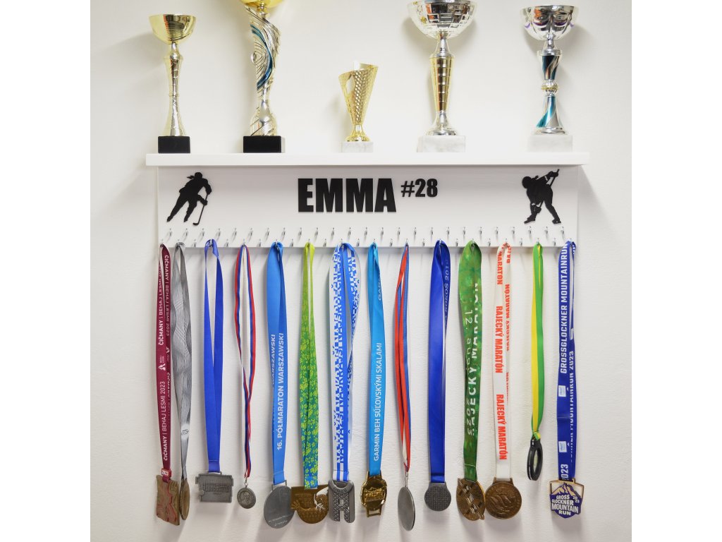 Nechajte vyniknúť vaše úspechy na našej dekoračnej poličke, ktorá je prispôsobená menom a číslo presne pre každého. Táto drevená polička na zavesenie medailí a vystavenie trofejí je nielen praktickým spôsobom organizácie vašich ocenení, ale aj štýlovou dekoráciou do vášho domova.