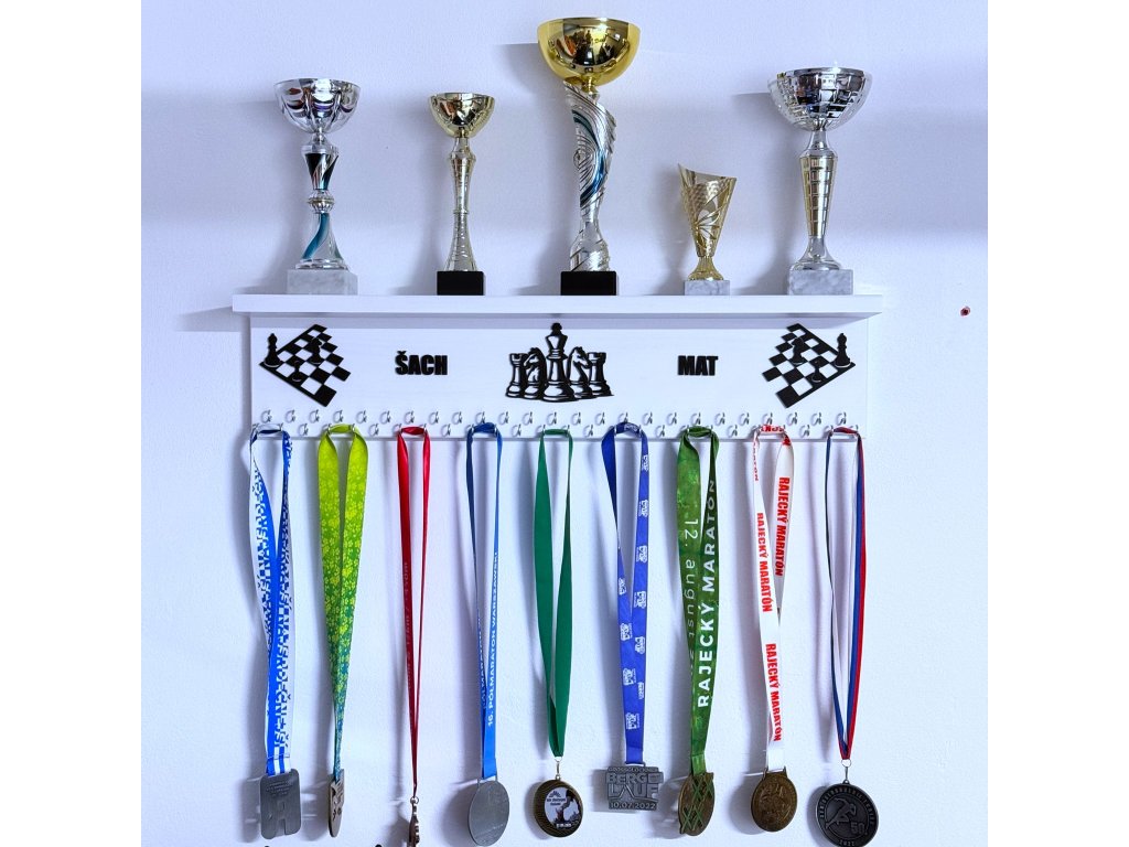 Tento vešiak na medaily s praktickou poličkou na trofeje je ideálnym riešením pre prehľadné a zároveň estetické uloženie športových úspechov. Dominantou dizajnu je šachový motív v čiernom prevedení, ktorý kontrastuje s čistou bielou poličkou a dodáva celku moderný a elegantný vzhľad.